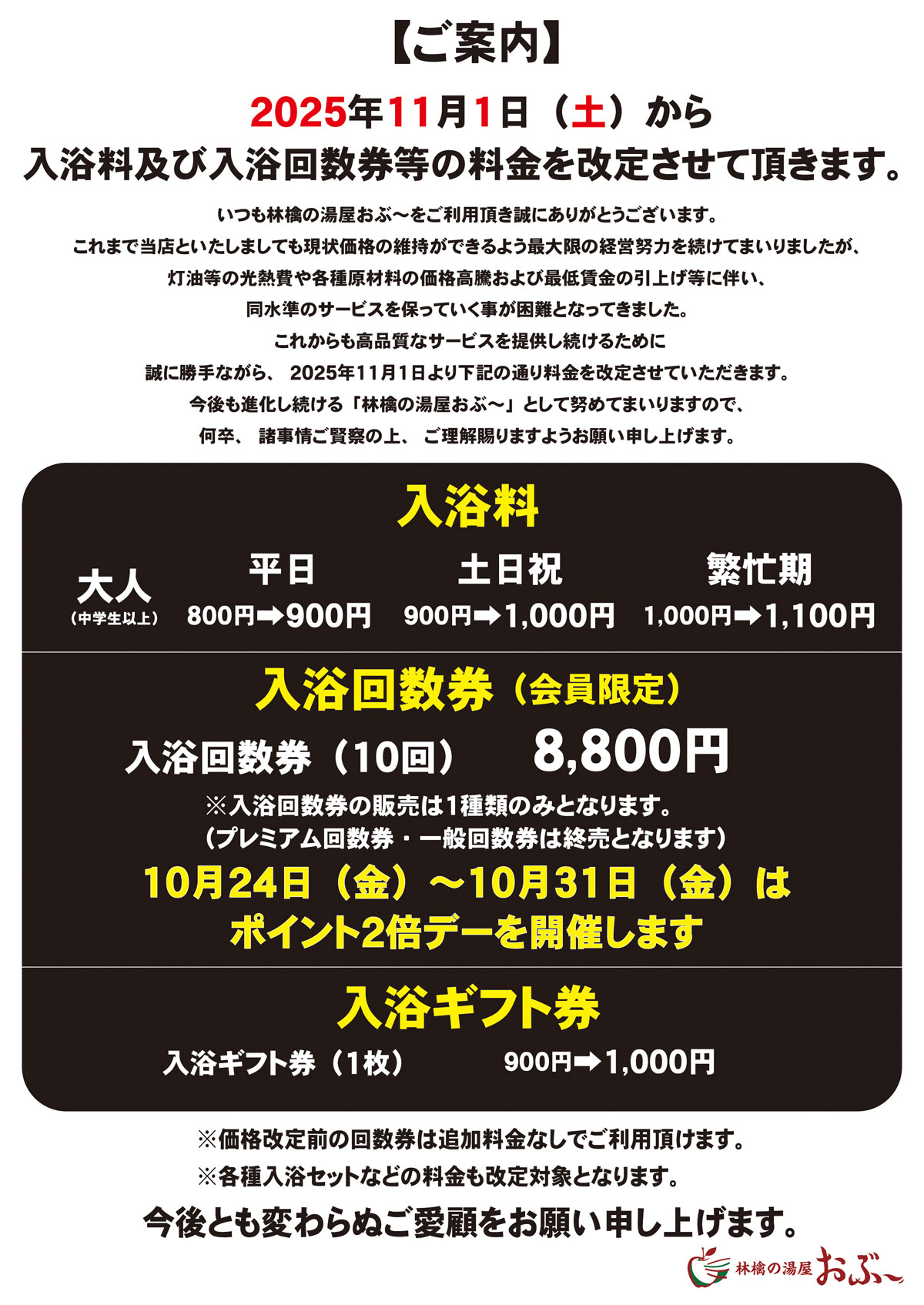 2025年11月1日(土)入浴料・入浴回数券料金を改定させて頂きます。[詳細]